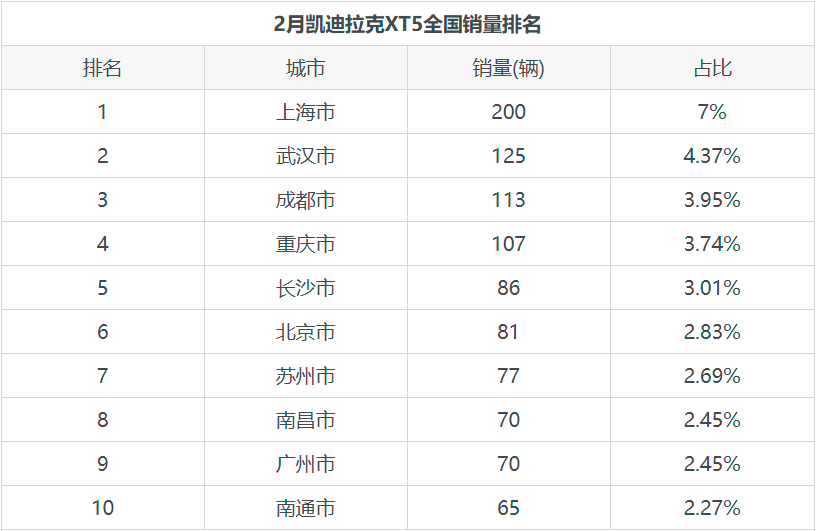 在2021年2月凯迪拉克XT5全国销量分布情况中,上海市以200辆的销量位列第1名,占全国销量7%;武汉市以125辆的销量位列第2名,占全国销量4.37%;成都市以113辆的销量位列第3名,占全国销量3.95%。