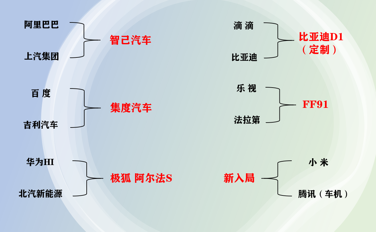比亚迪,吉利,江淮,上汽和北汽都有合作伙伴。对于“带资进组”的互联网企业来说,选择一家靠谱的企业很有必有,但是从目前来看,留给它们选择的机会不多了。