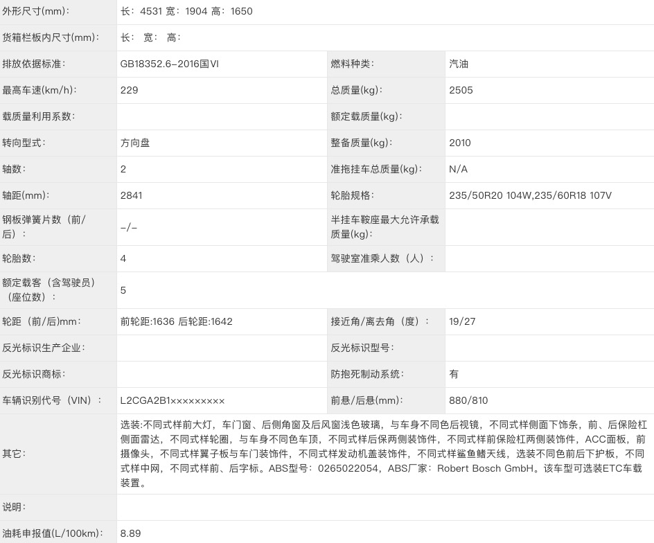 在车身尺寸方面,长轴版极光长宽高分别为4531*1904*1650mm,轴距达到了2841mm,足足比现款车型长了160mm!如此幅度的加长在目前同级别车型中还是十分少见的,虽然此次申报的是五座车型,但是不排除未来会推出七座车型的可能。