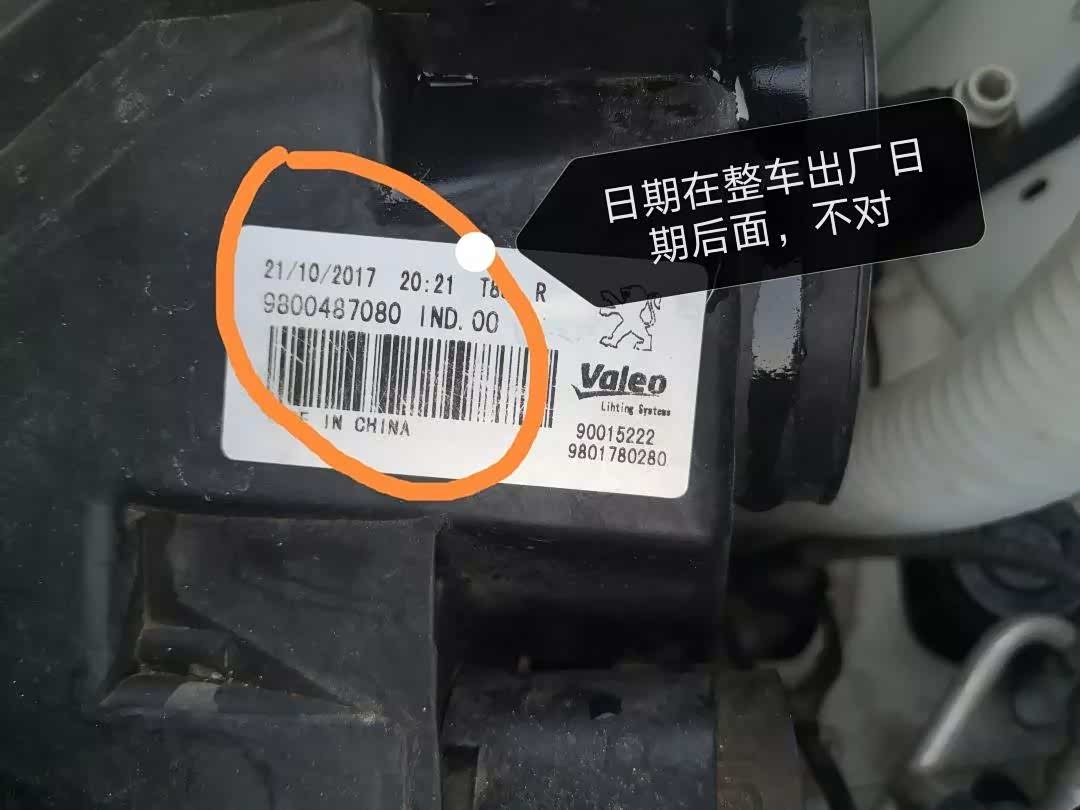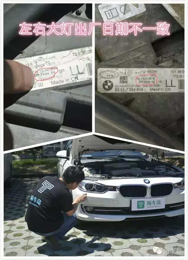 汽车大灯都有出厂日期标签,但是在安装过程中,会被撕掉或者装起来无法查看到。正常情况下,前大灯的生产日期比较容易看,打开引擎盖之后,大灯总成的上方都能看到生产的日期。如果发现两个大灯的生产日期和车辆出厂日期差距大(比如1年以上),或者两个大灯之间的日期差距也很大,这时候就小心了,说明大灯一定换过,通常肯定在大灯处发生过刮蹭或者事故,如果还要购买就要进一步检测大灯附近的损伤情况。举个例子,我们之前帮客户淘过的宝马328Li,这辆车就换过大灯,经我们检测就在大灯处被剐蹭,伤了大灯。