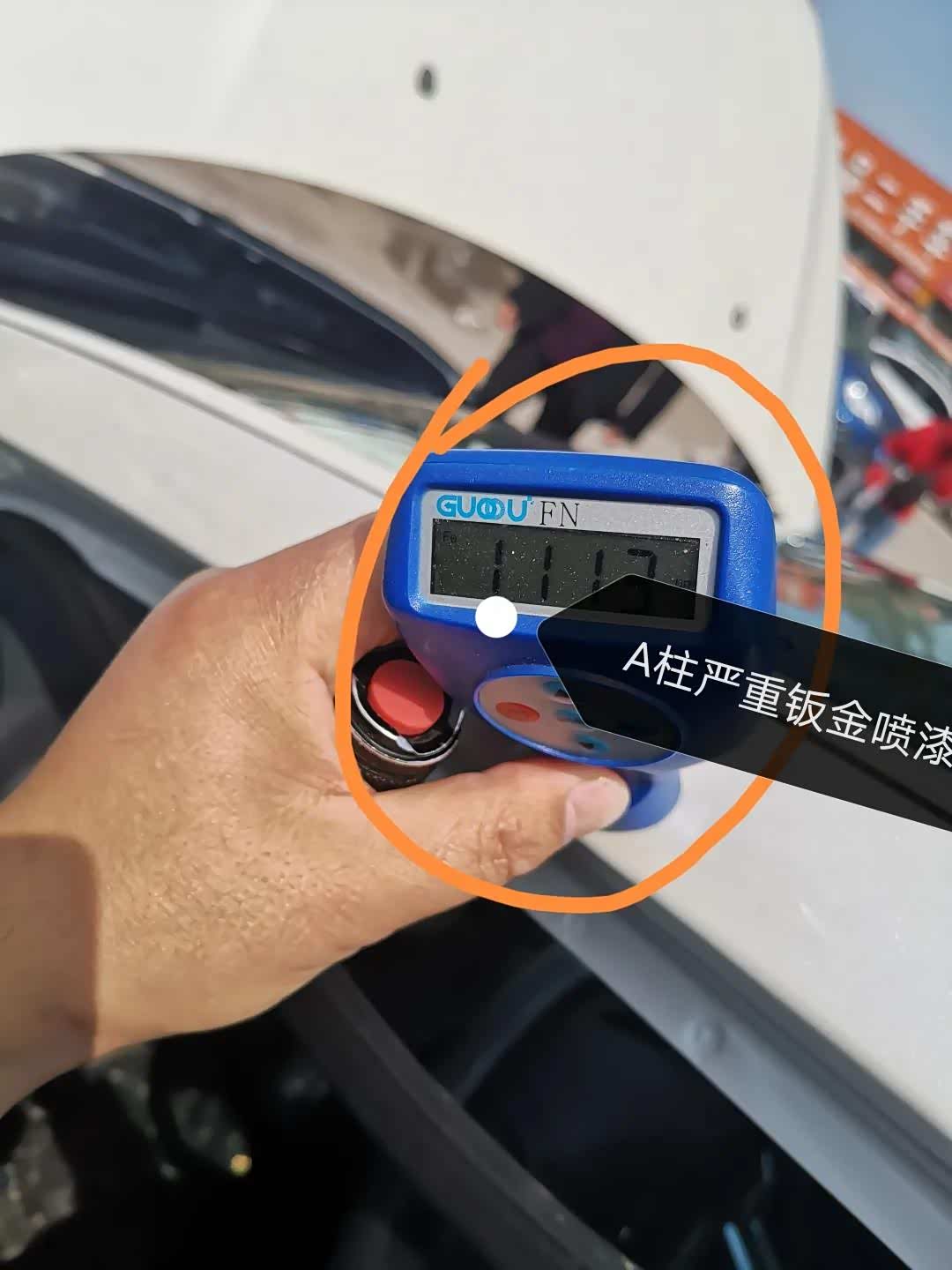 再看左侧,也不容易乐观。左侧A 柱有严重变形现象,钣金喷漆修复,漆面测厚仪测量值一千多微米(正常是100微米左右)。