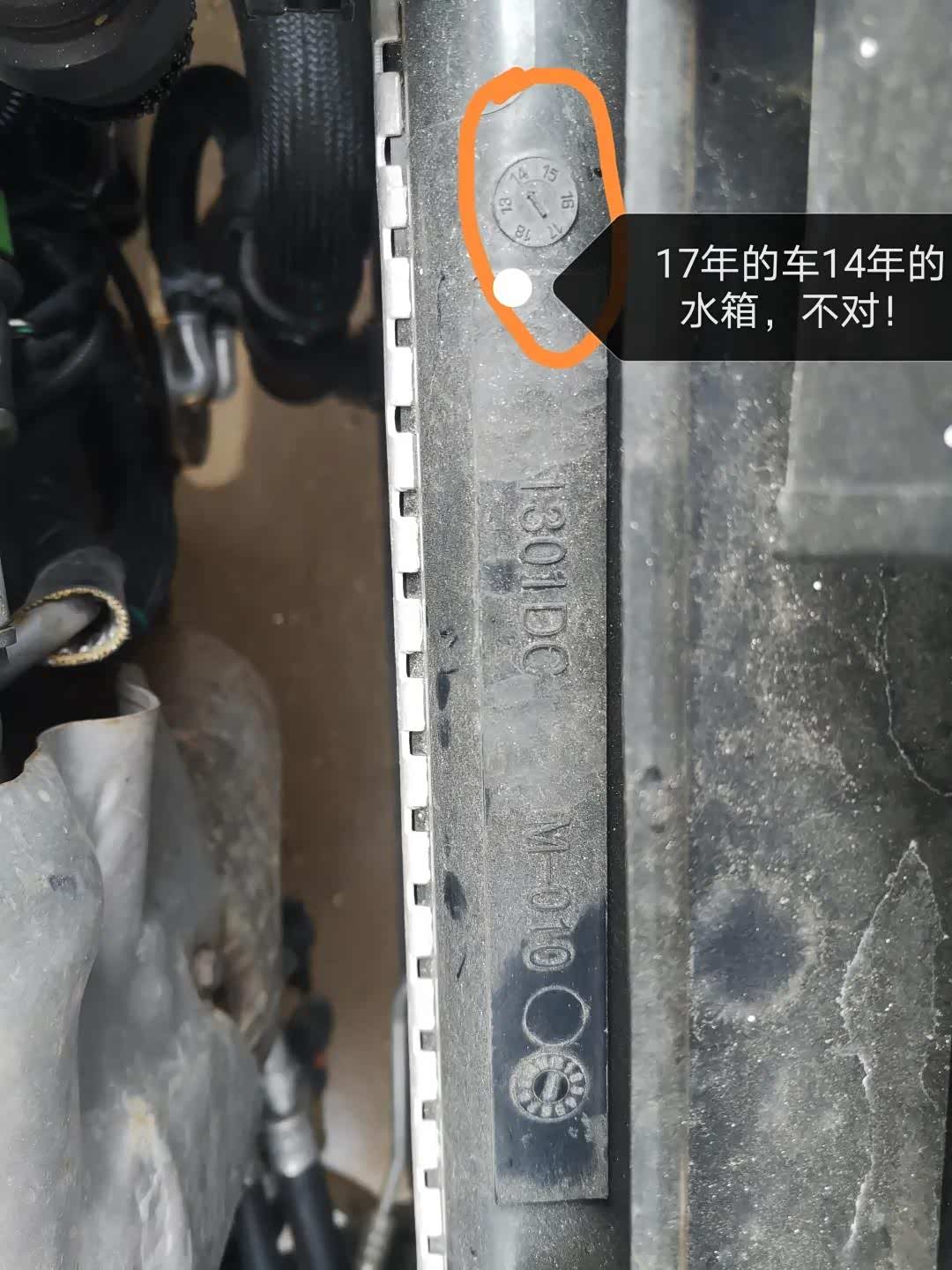 不过发现水箱框架更换过,应该还是拆车件。17年的车怎么能用一个14年的水箱呢?