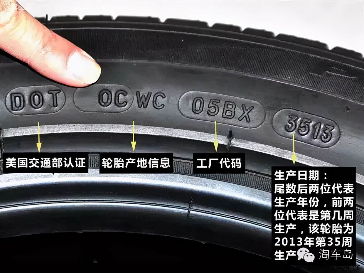 如何看轮胎的生产日期了?轮胎上一般都会有4位数字标注的生产日期,后面两位是年份,前面两位是第几周,比如,下图的轮胎就是13年第35周生产。