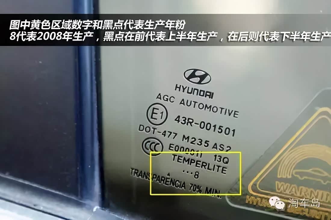 看见没?黄框区域有个8,还有几个点吧?8代表是那一年生产的,再数数,看有几个点,点数在数字前面拿7减,图中是3个点,就拿7-3=4,那么这个玻璃就是2008年4月份生产,如果点数在数字后面就拿13去减?也就是说这玻璃是2008年10月份出厂的。