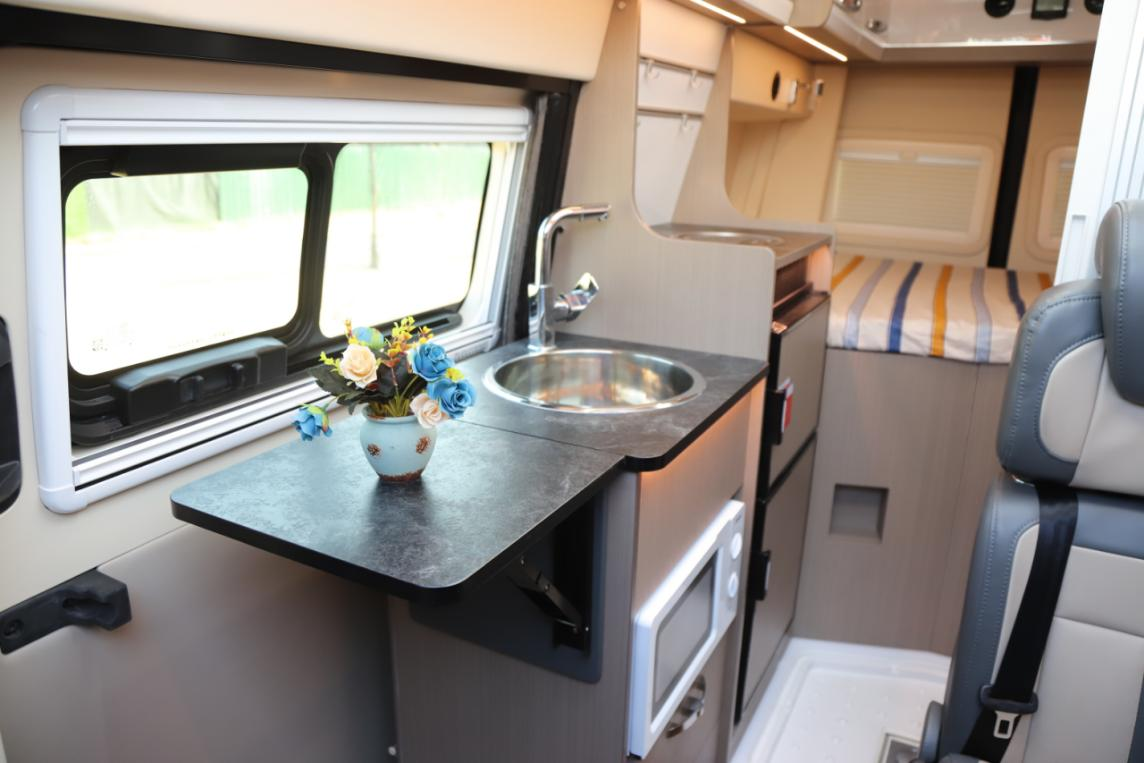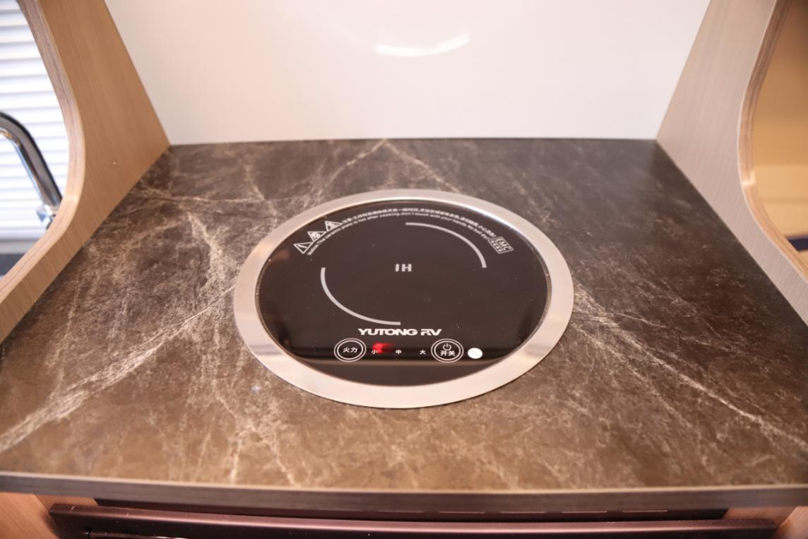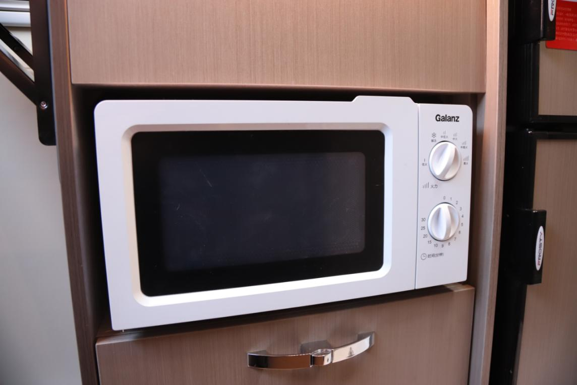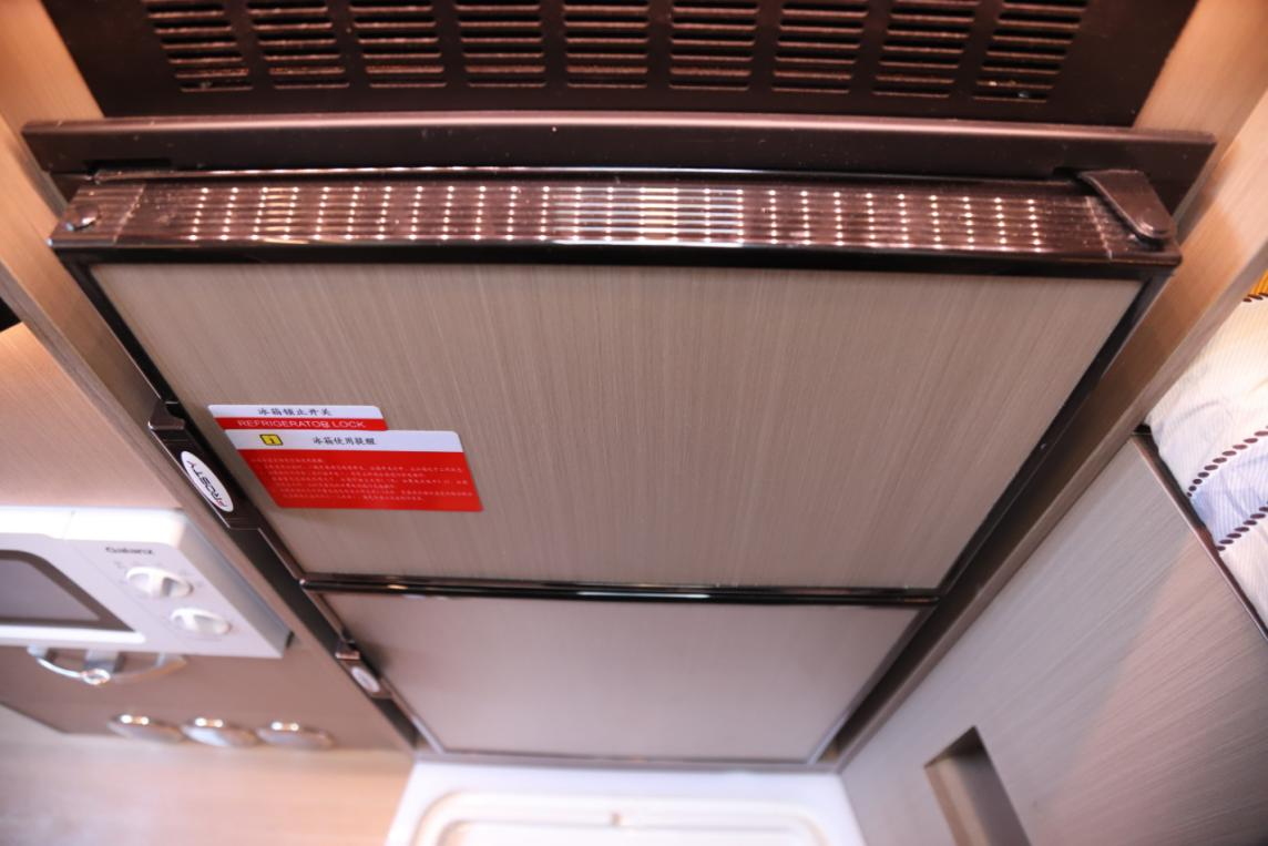 厨房区域安装了拓展小桌板,带有不锈钢水池。下面还安装了微波炉,位于水池右侧的是冰箱,冰箱顶部安装了电磁炉,85升的冰箱带有冷冻仓和冷藏仓。整车安装了一块225AH的免维护铅酸电池,标配2000W的逆变器。220V的逆变插座,外接220V电源接口和15米的电源线。集成控制面板带有水量和电量的提示。