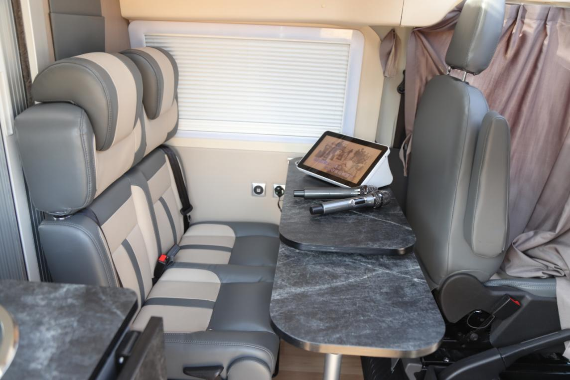 进入车舱内部可以看到,车舱中部安装了双人的豪华皮革座椅,主副驾的座椅也是皮革软包。中间的小桌板同时带有拓展和升降,功能非常强。车舱内部整体采用了深色的内饰风格,搭配浅色的仿木纹,内饰豪华程度直接拉满。