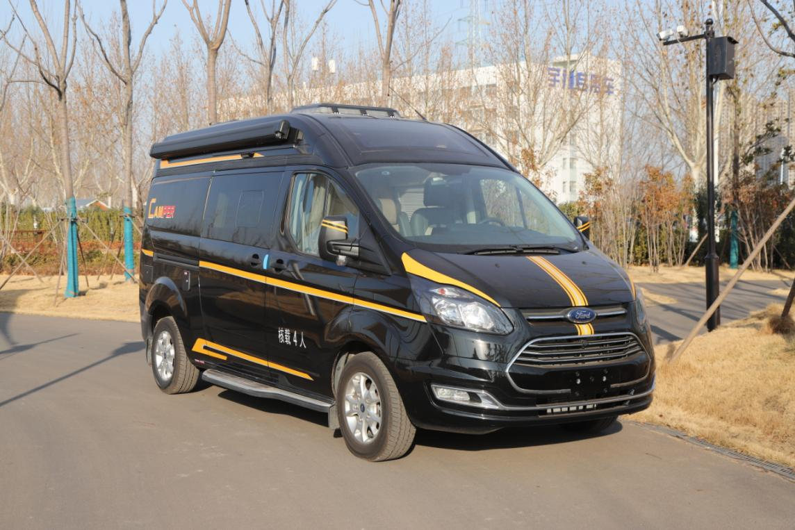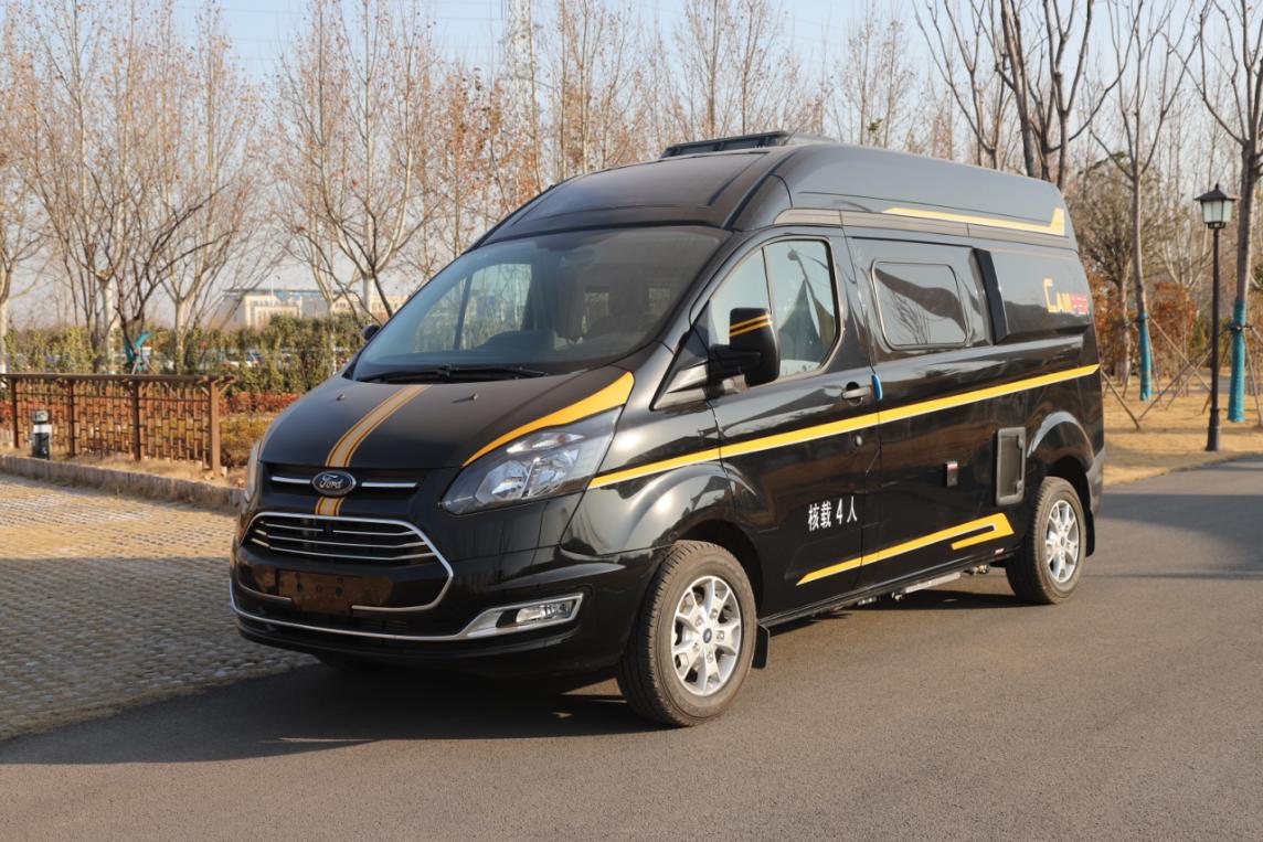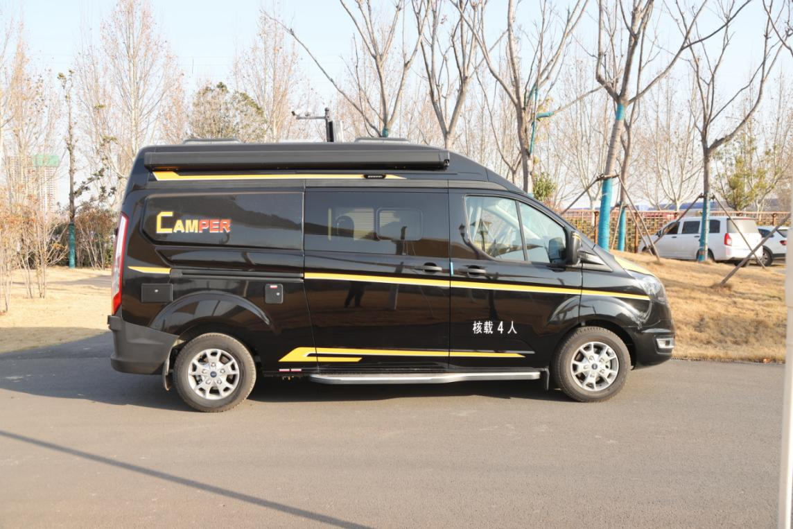 该车以江铃福特途睿欧商务车底盘改造,采用了高顶车身,以便提高房车内部的空间。整车采用了黑色的涂装,带有金色的拉花,搭配漂亮的铝合金轮圈,使外观尽显尊贵。