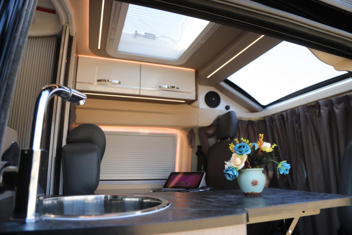 外饰部分安装了手动遮阳棚,前部搭载弧度全景天窗玻璃,乘客区和睡卧区都安装了带帘的全景天窗。另外车辆采用后围推拉窗和外推窗、乘客门原车推拉窗,中门还安装了防蚊网。