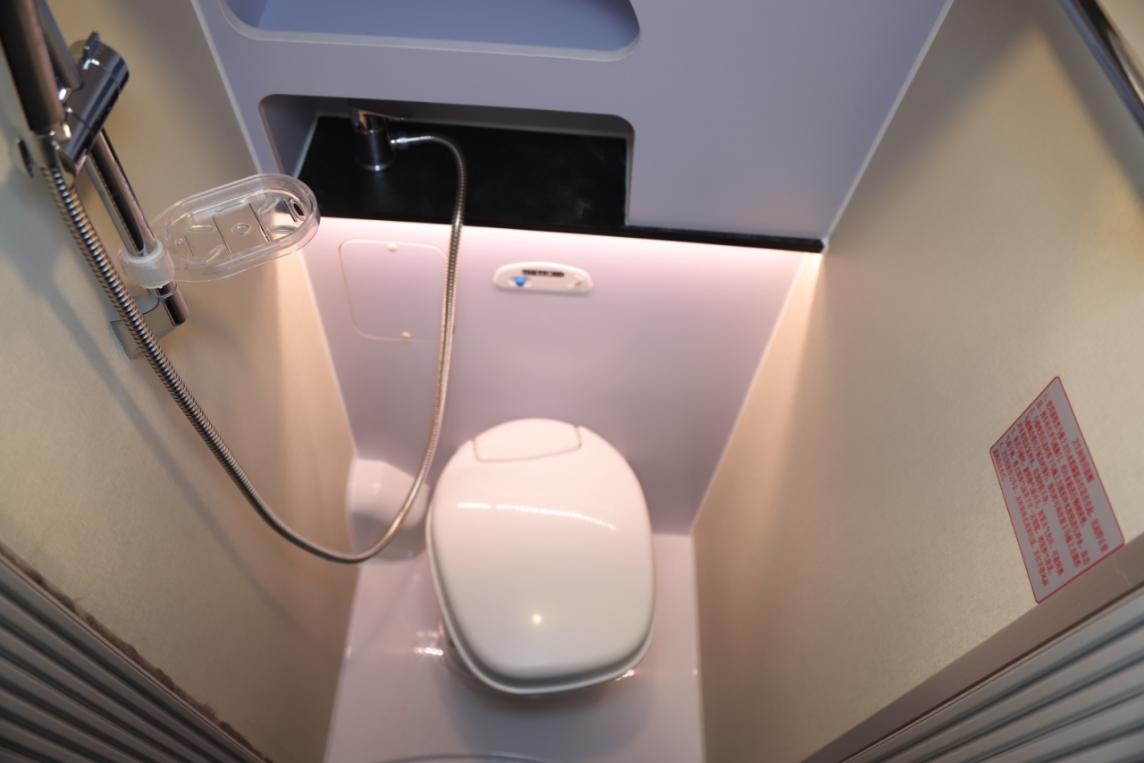 来到卫生间区域,卫生间为拓展式设计,里面安装了梳妆镜、毛巾杆、淋浴花洒,换热式热水器可以保证洗澡有充足的热水。卫生间内部带有独立马桶,该车具备90升净水箱,50升污水箱。