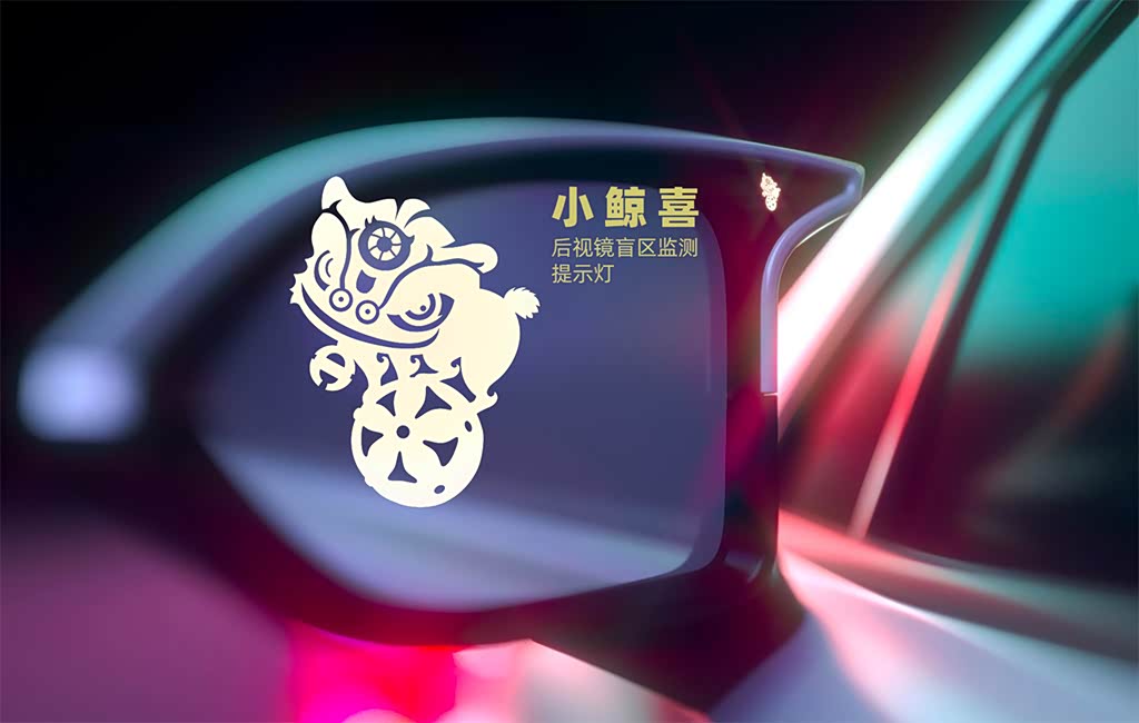 侧面也有很多小“鲸”喜,像是外后视镜上的盲区检测提示灯,采用了具有中国特色的舞狮造型,将中国文化的精神融入到了产品设计中。而正是这种细节的设计,更容易打动消费者。