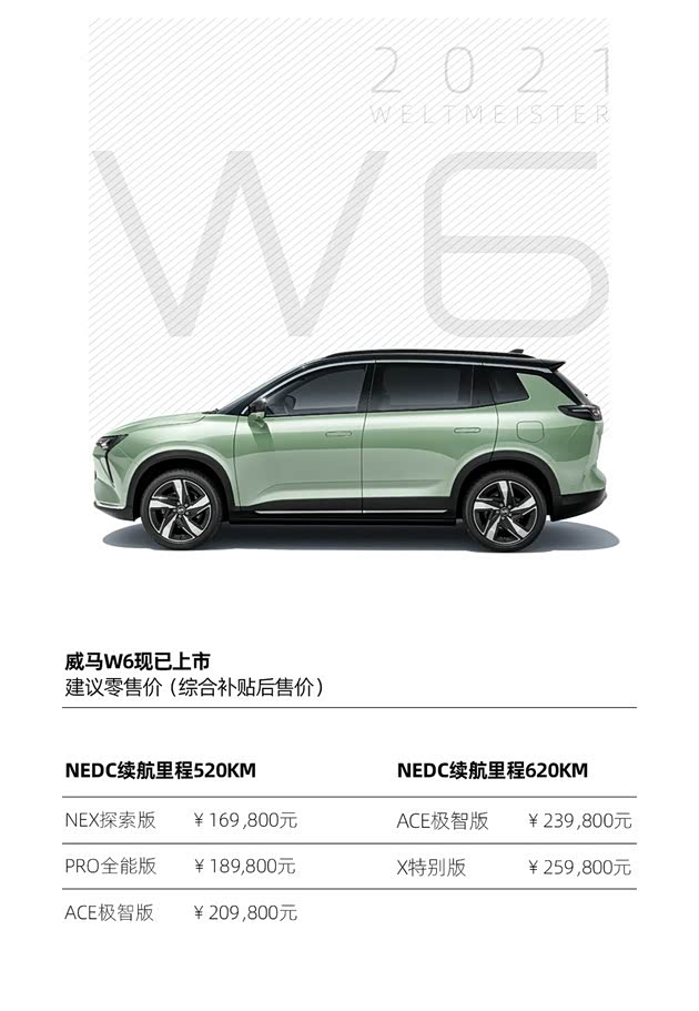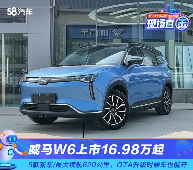 2021年4月16日,威马汽车第三款全新智能纯电SUV—— 威马W6正式上市,W6发布了5款车型,分为520km和620km续航,补贴后售价16.98-25.98万元。与此同时,威马还发布了产品规划,每年至少要推出一款全新的车型,除了SUV之外,之后还会推出轿车和MPV,也不排除推出其他类型的车型,威马CEO沈晖表示,威马只做纯电的智能汽车。