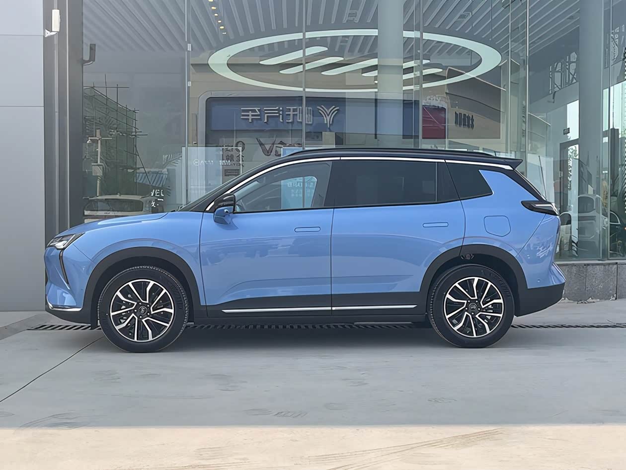 威马W6的车身侧面,线条十分流畅,车身长宽高分别为4620×1847×1730mm,轴距达到2715mm,标准中型SUV的尺寸。