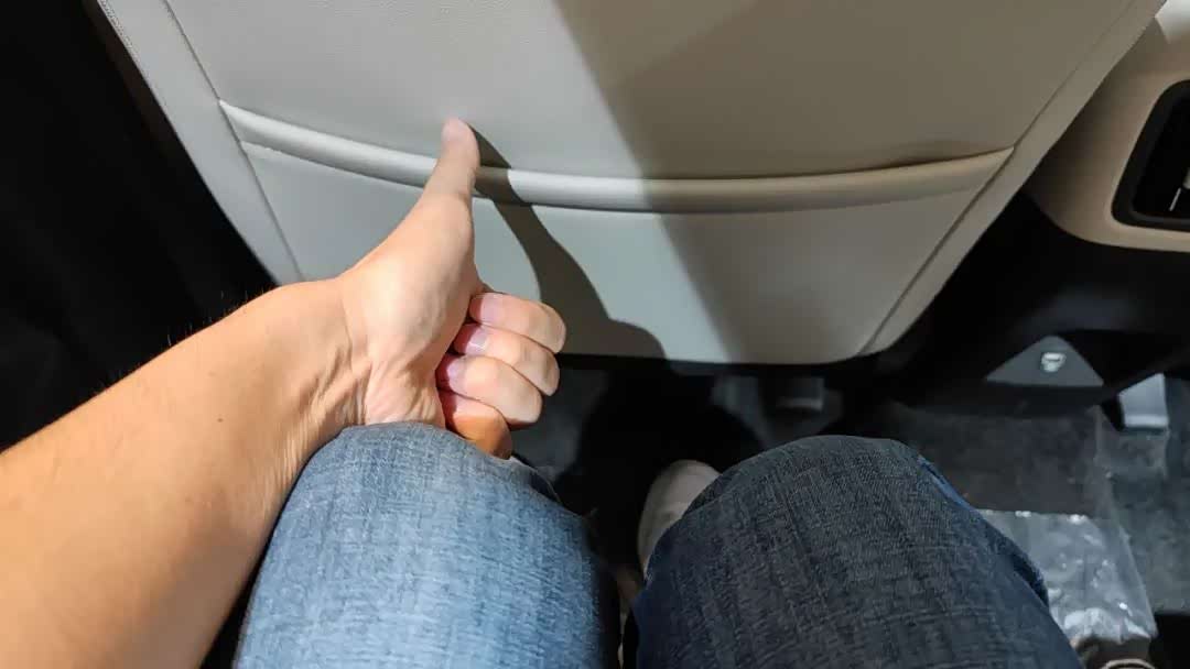 来到后排,椅背可调节幅度极大的座椅惊艳全场,正常坐姿下它的头部空间一拳,中规中矩,而一旦放躺,乘坐者能近乎变成一个半躺的姿态,头部空间瞬间变得十分宽敞。但美中不足的是,它的中央扶手会随着椅背调节而改变角度,椅背最躺的状态它变得高高上翘,和门板扶手形成巨大的高度落差,在人体工程学上差强人意。