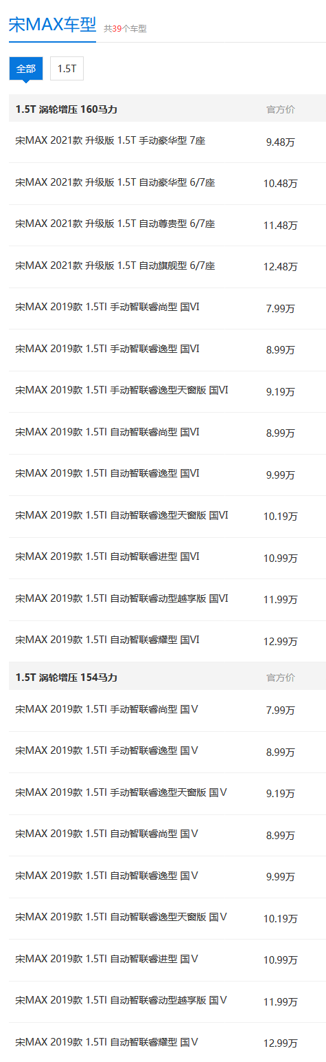 比亚迪宋MAX搭载的只有1.5T涡轮增压发动机,最大马力160Ps,最大扭矩245Nm,搭配6挡手动和6速双离合变速箱。动力方面没什么太多的亮点,中规中矩的水平。