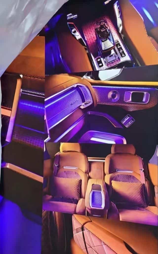 内饰方面,坦克800相比坦克700,更加奢华。新车整体采用紫色与米色装饰搭配,中控大屏、与坦克700类似,中控区域采用大量木纹材质装饰,增加高级感。据WEY品牌内部员工透露,坦克800内饰对标的是劳斯莱斯库里南。