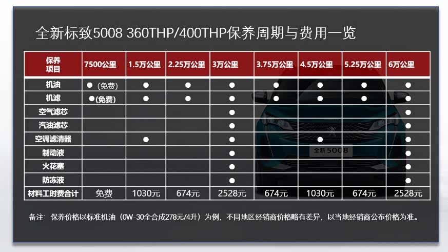 从保养费用看,全新标致5008不管是360THP车型还是400THP车型,保养费用是一致的,在首保过后,小保养一次的费用在674元左右(含工时费),大保养一次的费用在2528元左右。火花塞、燃油滤清器、制动液、防冻液每3万公里更换一次。