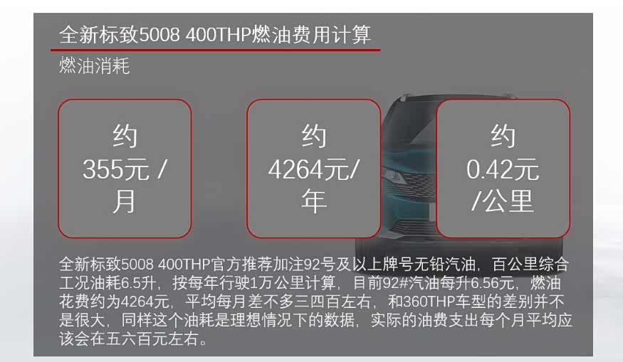 我们以每年行驶1万公里、保险缴纳车损险与第三者责任险100万,再加不计免赔,未出险情况下保费第二年8折,第三年7折,三年平均保费,这些条件来计算全新标致5008 360THP和400THP车型每年的用车成本,结果如下: