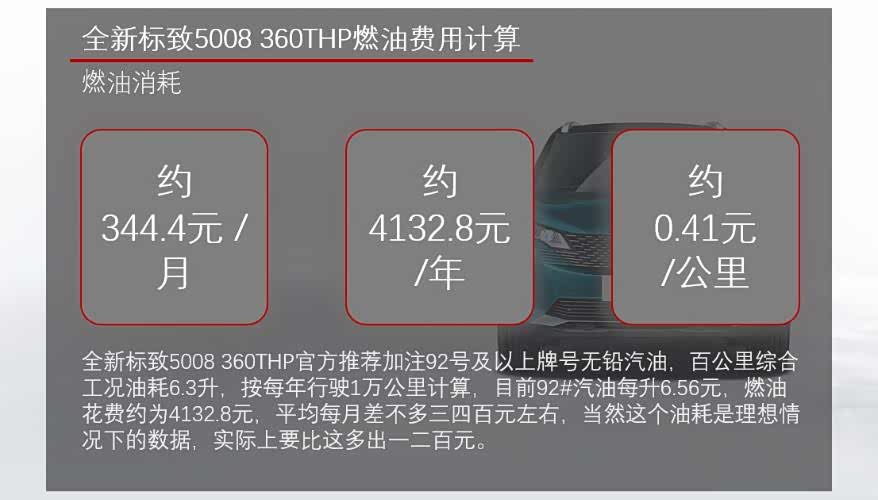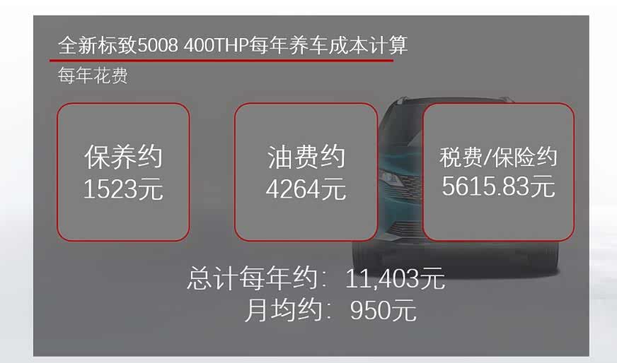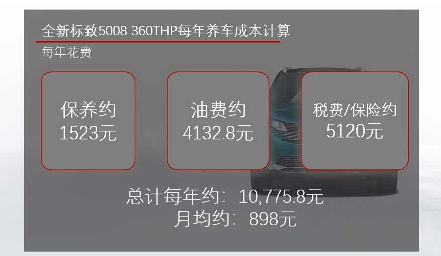 根据全新标致5008的保养费用以及燃油消耗费用,再加上税费和保险,三年下来,不管是360THP车型还是400THP车型,年均用车费用都超过了1万元,月均费用在八九百元左右,需要说明的是,这个费用我们是按最低限度计算的,如果跑的里程比较多,油耗按实际情况计算的话,再加上停车、洗车等费用,每月肯定是要超过千元以上的。
