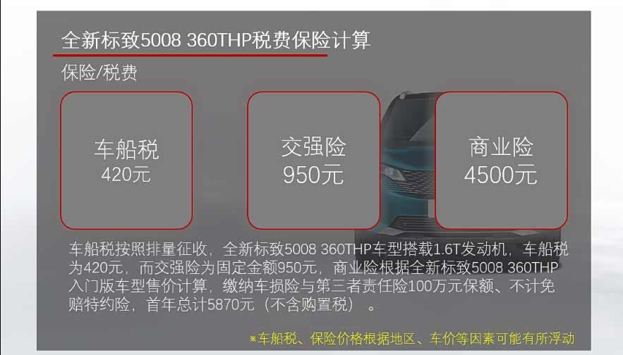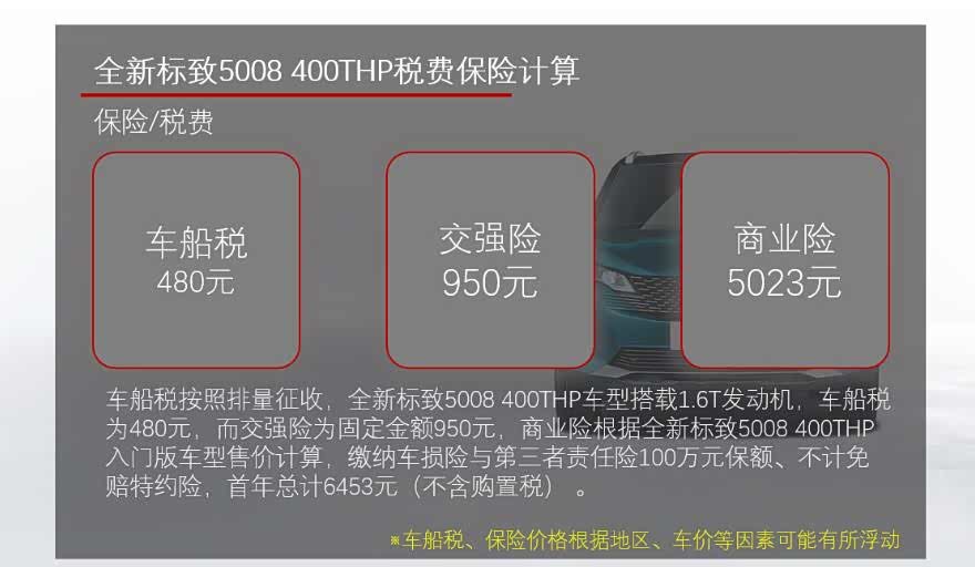 在税费部分,全新标致5008 360THP车型每年车船税为420元,交强险为950元,商业险部分我们根据全新标致5008的360THP入门版车型的售价计算,选择车损险和100万元的第三者责任险,再加上不计免赔来计算保险金额,每年约4500元,加上车船税和交强险的费用合计是5870元。而全新标致5008 400THP由于搭载的是1.8T发动机,车船税要略高一点,保险依旧以全新标致5008 400THP入门版车型售价计算,年均税费和保险支出合计约为6453元。需要注意的是,如果在首个保险周期内没有出险或违章,次年的保费还可以打折。