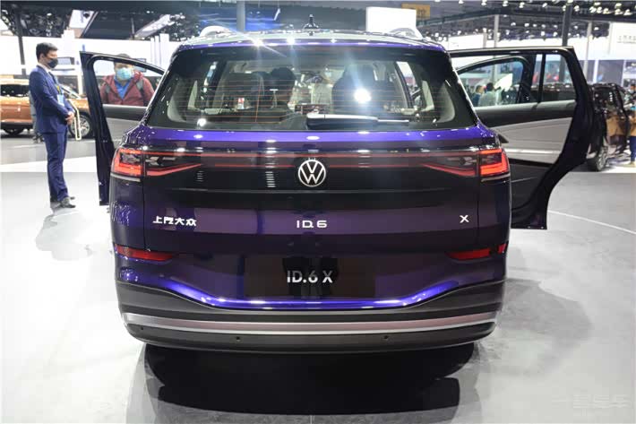 移步车尾,ID.6 X同样采用了贯穿式尾灯,同时大面积黑色饰板的采用,让车尾的视觉效果都集中在了尾灯及LOGO部分,看上去十分大气。而这样的设计,也使得牌照框被移动到了下方,因此通过牌照框也能区分出二者的区别。
