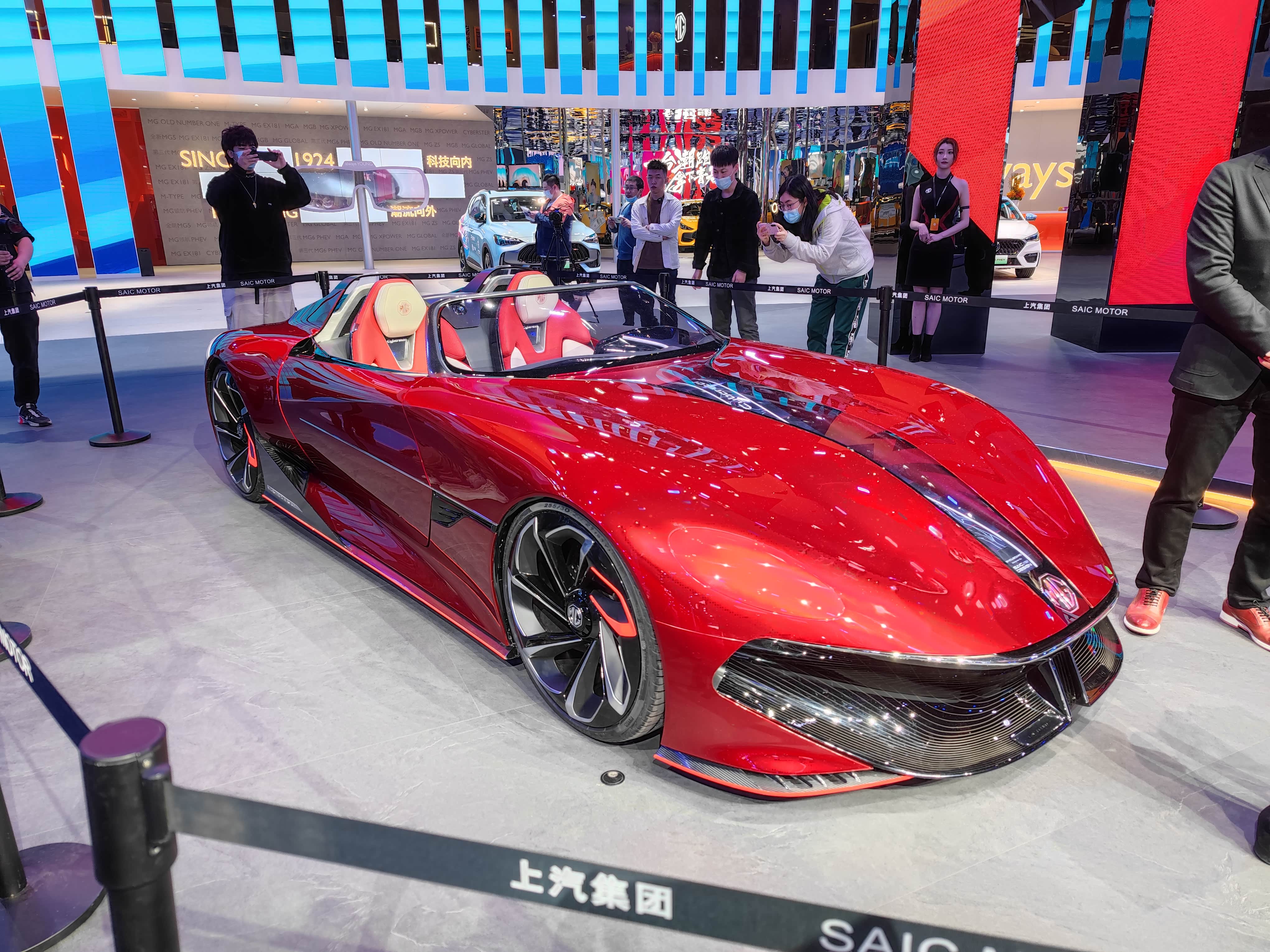 车展的展车与我们之前实拍体验的是一台车,整车还是采用这样一个非常前卫的造型设计,巨大的名爵LOGO、带有呼吸灯的中网和底部巨大的扩散器等元素都让这台车散发着激情的元素。整车侧面采用了欧式roadster敞篷跑车的风格,巨大的轮圈气势十足。车尾尾灯点亮后呈现出箭头形状,非常具有辨识度。