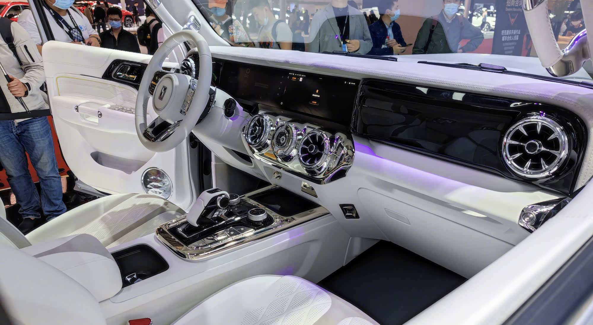 与坦克700同级别但不同定位的坦克800也一起出现在了展台上,它的定位是高端硬汉式商务SUV,颜值上面有点像奔驰迈巴赫GLS和库里南的结合体,展出的是一台双拼车身版,应该也有纯色版本,前脸采用了直瀑式中网设计,但是其中的镀铬饰条更粗大,看着更扎实,WEY的logo和劳斯莱斯的形状还有点像,两侧的大灯也是那种简单的正方形灯罩包裹的,简单但气宇轩昂。