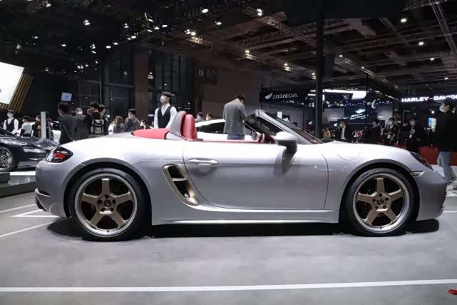 保时捷718 Boxster 25周年纪念版限量1,250台发布,此次上海车展是其在中国的实车首秀。新车采用保时捷家族式设计语言,“蛙眼”式前大灯组依旧炯炯有神,外观采用银色,且在进气格栅、侧进气孔、轮圈等地方都采用铜色材质。新车采用贯穿式尾灯,拥有不错的辨识度,同时,在车尾中央还印有“Boxster 25”字样,凸显其周年版身份。