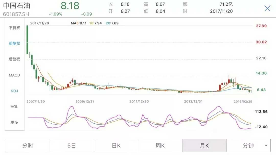 这不禁让我想起“问君能有几多愁?恰似满仓中石油”,看看中国石油“前复权价”的K线图,该股上市首日即为最高价45.94元,随即狂跌10个多月,至2008年9月18日低见7.22元,区间跌幅高达84.28%。此后也没能突破20元的关口,现在股价还在4-5元区间内震荡。