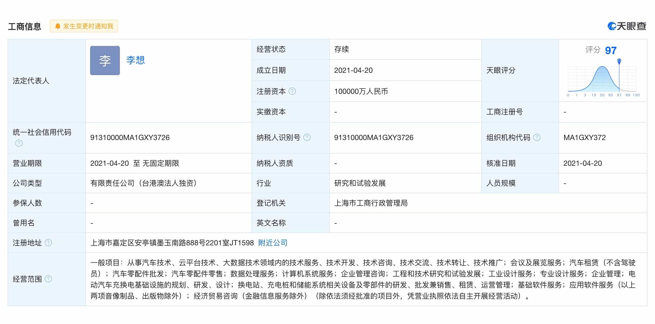 近日,根据天眼查查询显示,上海理想汽车科技有限公司成立,法定代表人为李想,注册资本为 10 亿元人民币,注册地址为上海市嘉定区安亭镇墨玉南路,经营范围包含:从事汽车技术、云平台技术、大数据技术领域内的技术服务、技术开发;电动汽车充换电基础设施的规划、研发、设计;换电站、充电桩和储能系统相关设备及零部件的研发等。