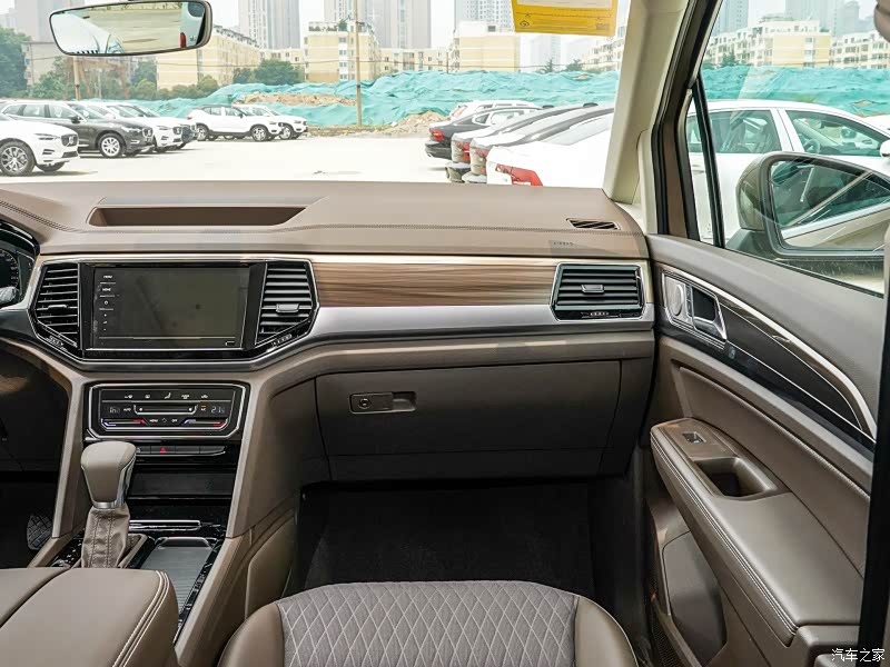 现在来看一下前排内饰,标准大众式的设计风格,看上去和大众途昂差不多,尤其是传统T型对称式的中控台恪守中庸之道,大量真皮材质覆盖加以钢琴烤漆面板、木质装饰材料点缀,在棕色主色调的烘托下显得很有质感。