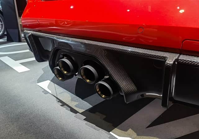 中置四出排气的布局方式十分抢眼,尾流扩散器以及尾翼也采用了碳纤维的材质,凸显了尾部的战斗气息,有着十分强烈的视觉冲击力,狂暴驾驶机器的称号得以延续。