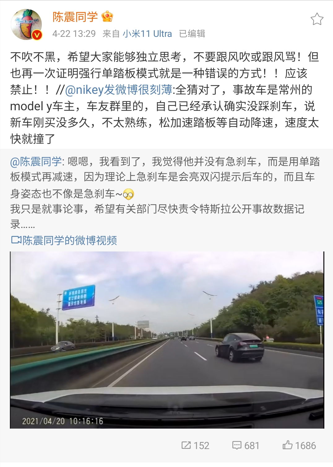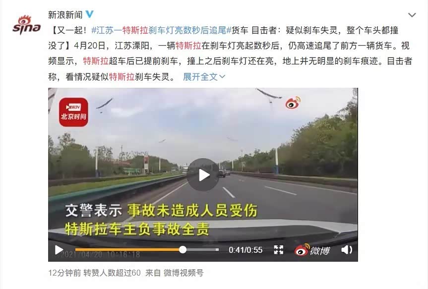 驾驶员忘记踩踏刹车导致“失控”,也的确得到了部分驾驶员的证实。回顾一些失控事件,例如几天前江苏特斯拉Model Y追尾事件中就出现了刹车灯已经点亮,车子没有明显减速导致追尾的事故!最初我认为刹车灯点亮可以佐证车主采取了刹车行为,而特斯拉车子并没有减速,所以是车子无故失灵!但车主迅速回应说本次事故是因为自己没有熟悉单踏板操作,在车辆高速行驶时仅抬起油门踏板等待车辆刹停!同时有特斯拉车主表示轻抬加速踏板,只要车子开始减速。刹车灯就会点亮,因此很明显不熟悉单踏板操作的确会造成所谓的“刹车失灵”。