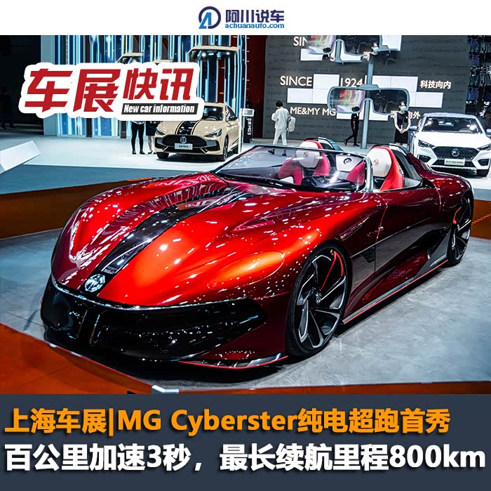 在展台中央的C位,就这样安静的停着一台超跑姿态的新车,21寸的轮胎以及贯穿车身的红色线条,配合车头处夸张的黑色“大嘴”,无一不彰显着它的运动属性。这就是名爵在上海车展中带来的全新车型——MGCyberster。