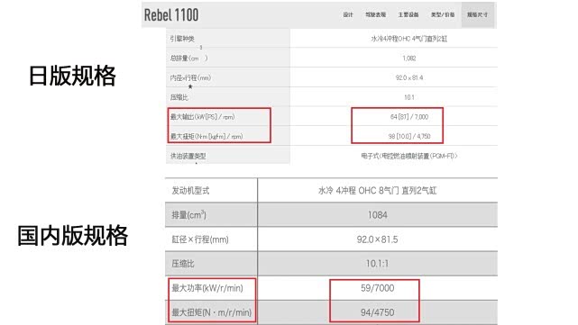 本田CM1100同样没能躲开阉割的命运,只是相对而言缩水的幅度小一点,CM1100在国外叫做Rebel 1100,对比日本版规格(下图),国内版本最大功率59kw(80Ps),最大扭矩94Nm,马力缩水7匹,扭矩缩水4Nm,这个幅度其实还能够让人接受。