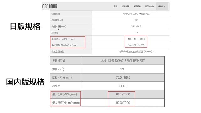 作为本田Neo sports cafe系列旗舰,本该拥有出色的动力表现,结果让人大失所望!对比日本版的动力参数(下图),国内版本的功率缩水40.9kw(55.6Ps),扭矩缩水13.7Nm。不仅如此66.1Kw的最大输出与CB650R(56kw)相差仅10.1Kw。