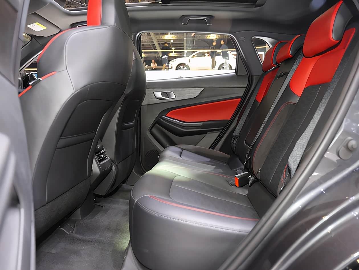 后排座椅同样柔软且宽大,没有为了偷空间而把座椅坐垫缩短。红色缝线的点缀与车门板处颜色一致,红黑搭配很经典。