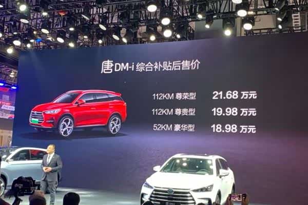 今天我们要聊的是另外一个方向,准确来说是另外一个方向上的一款新车,它就是比亚迪新款唐DM-i,这款车在前两天的2021上海车展中正式上市了,一共推出了3款车型,指导价格区间为18.98-21.68万元,其中18.98万元的低配豪华版纯电续航为52公里,其余中配和高配车型的纯电续航为112公里。