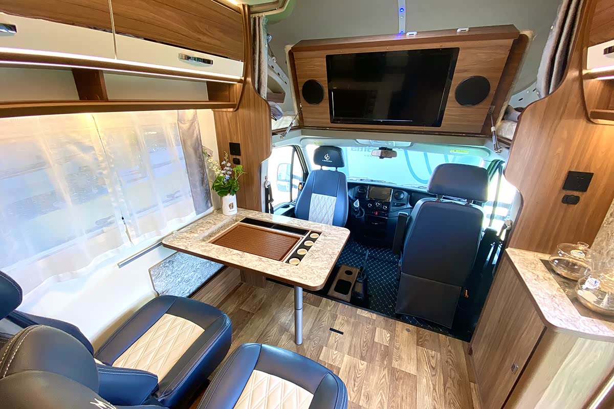 车厢前部为客厅区域,比较特别的是,配备了汽车专用座椅,且仅为单排结构,虽然核载人数为4人,但每个乘客的腿部空间都更宽裕。主副驾驶座椅均可向后旋转,搭配中央的餐桌可容纳4人就餐。客厅区域还配备了自动泡茶机,餐桌上也集成了小茶几。