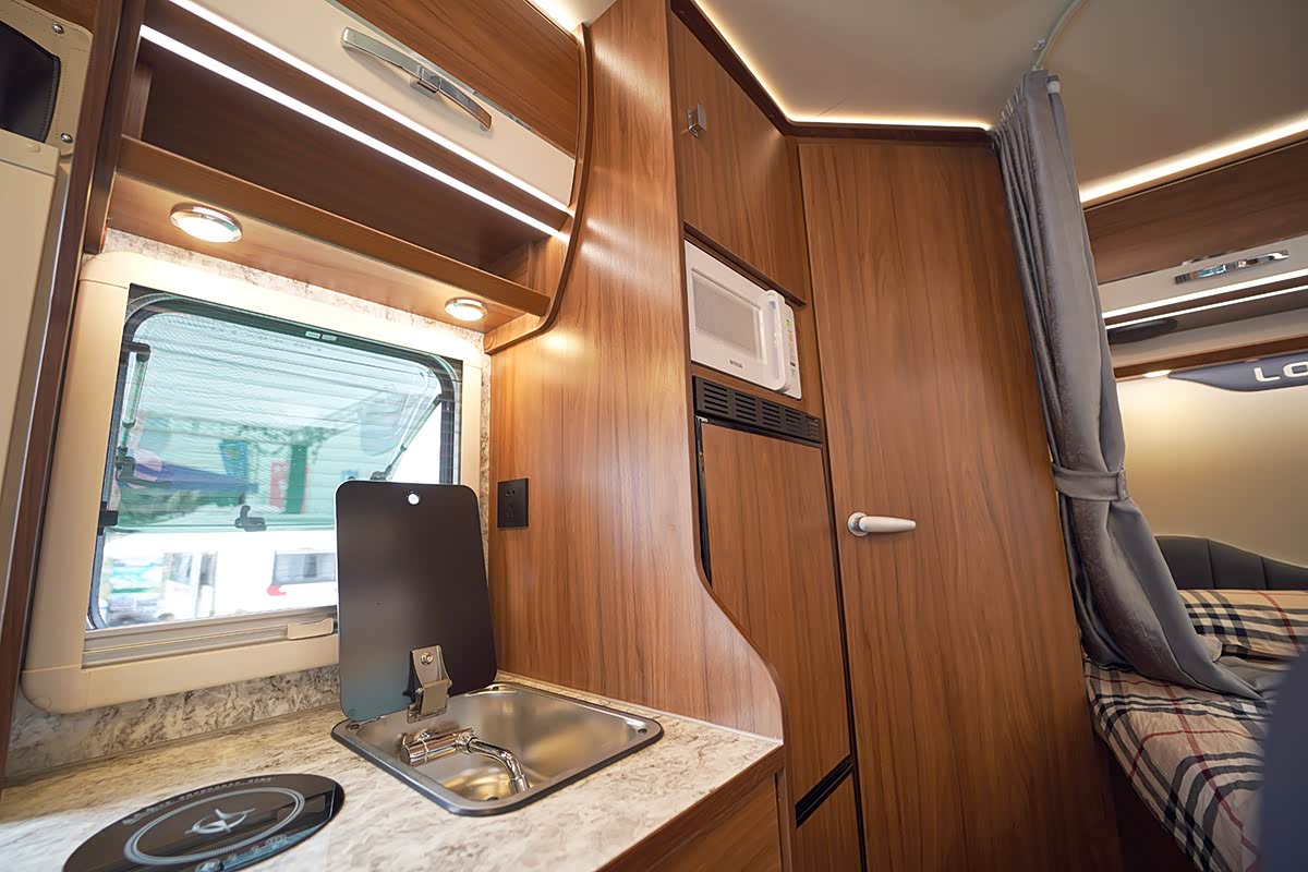 厨房区配备了电磁炉、洗菜池及148升车载冰箱,另外车内还配备了带烘干功能的洗衣机。