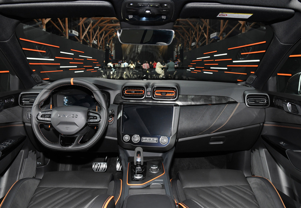 领克02 hatchback座舱也显露出了很强烈的运动氛围,中控台偏向驾驶位置,黑色的主色调搭配橙色饰条,具有视觉张力。用料上,大面积使用了翻毛皮材质包裹,连档把也是,手感极佳,并且在中控台上半部采用了碳纤维纹理修饰,加上桶式运动座椅和换挡片的配置,给你赛车手般的驾驶氛围。