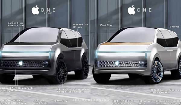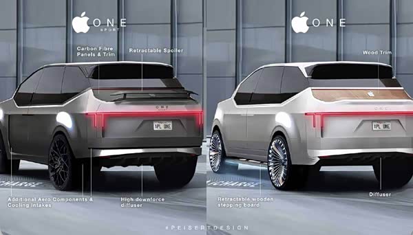 据海外媒体猜测,苹果将为首款车型两种不同性能,分别为Apple ONE和Apple ONE Sport,从假想图看,苹果新车充满未来感和科技感,Mac Pro设计元素的封闭前格栅,发光的苹果LOGO、可伸缩后视镜、对开门设计、可伸缩扰流板以及前后贯穿式LED灯组和激光大灯等非常前沿的设计和配置,令人不得不赞服设计师的“脑洞大开”。