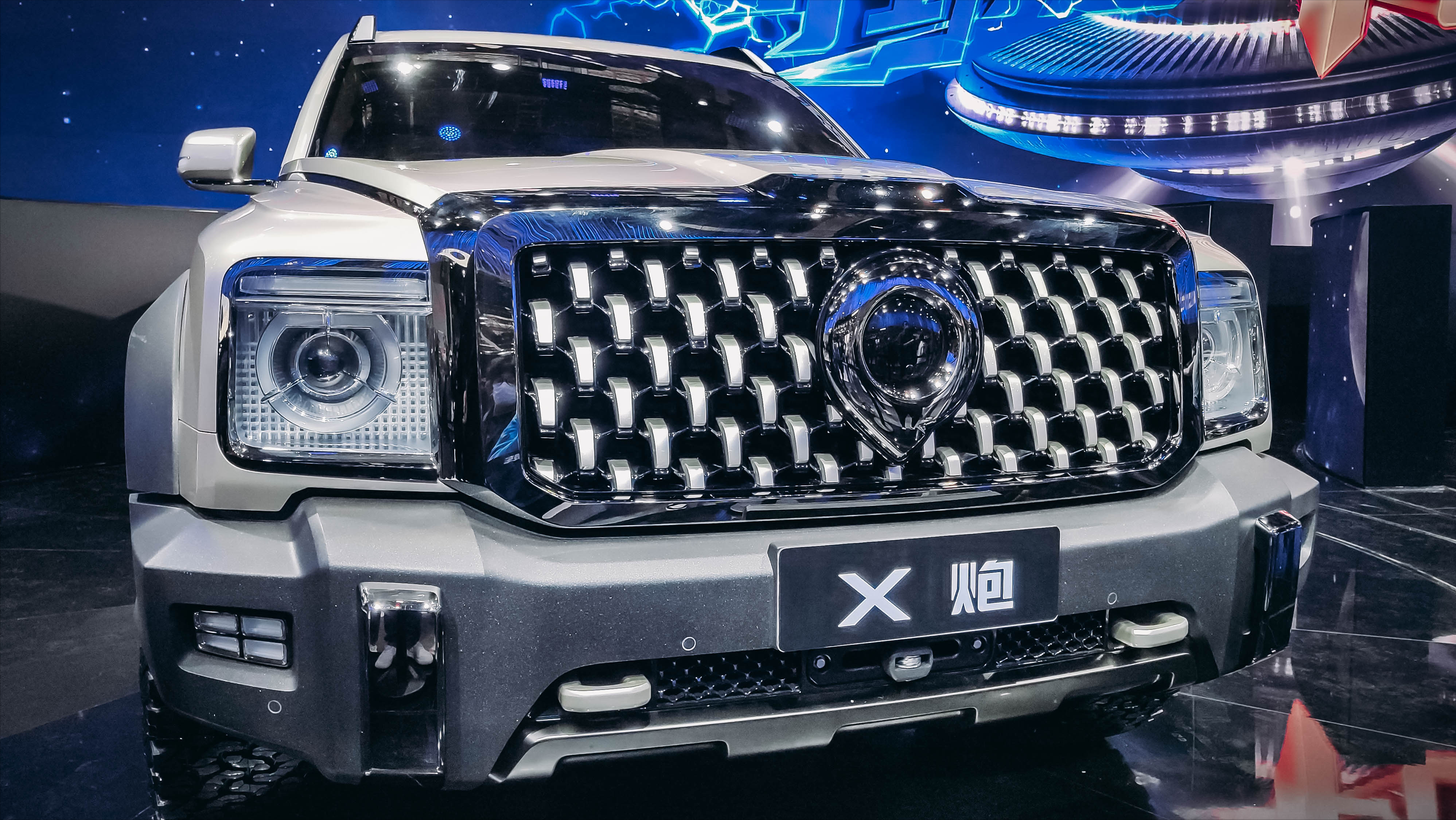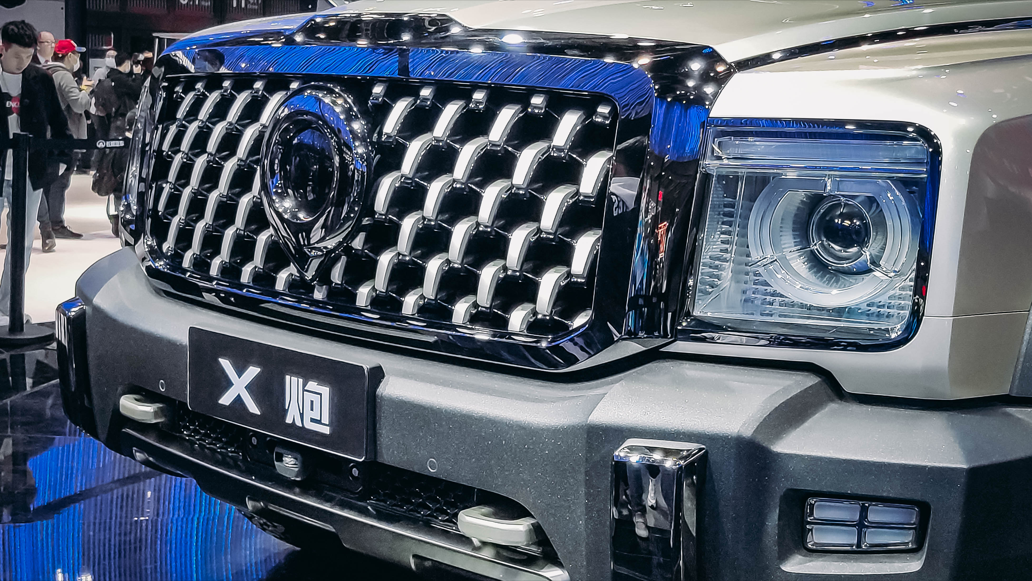 长城X炮的车灯设计较为犀利,圆形日行灯强调了类比玉环的精致感,点亮后有着很强的视觉效果。长城X炮的进气格栅采用了类矩形布局,粗壮的镀铬边缘肌肉感十足,星空中网较为精致,与旗舰定位相称。