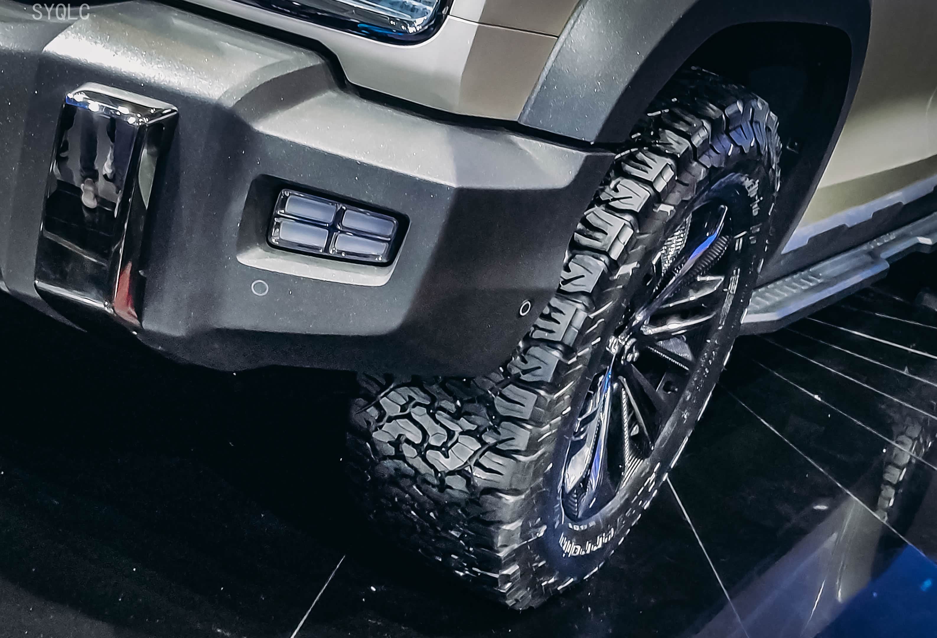 长城X炮得益于全尺寸的车身,使其视觉上较为舒展,比例匀称。可以看到,长城X炮的侧面有着较强的整体感,横贯全车身的腰线对车身造型比例也实现了协调的划分。而长城X炮车身下半部分向内凹的钣金设计所形成的光影效果,也让整车的肌肉感进一步加强。这台长城X炮的轮胎配置方面,其采用了20寸的大轮毂设计,同时与之搭配的是AT越野轮胎,综合来看这套配置提升了整车的越野能力,也同时为整车的气质增色不少。