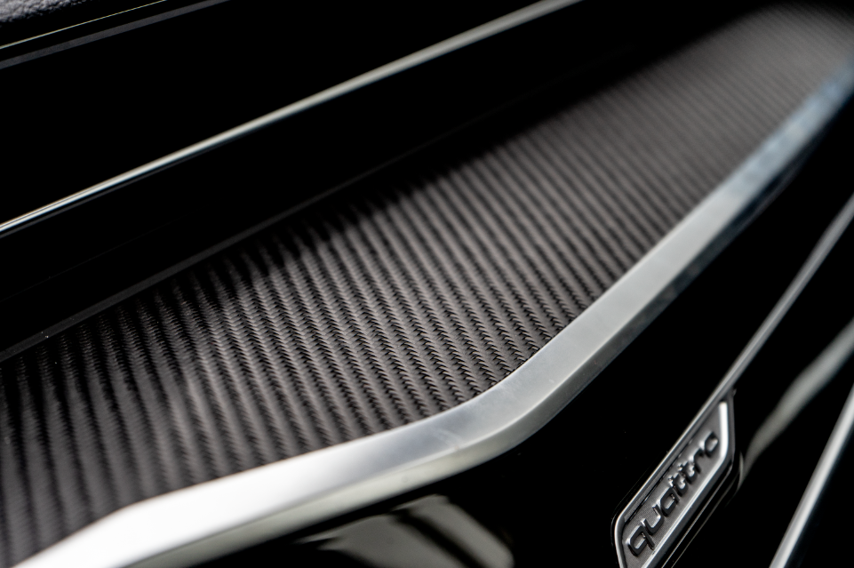 不过“富贵”也藏在细节之中,如果你仔细地看过了这台RS6 Avant的内饰用料之后,自然也会喜欢上这种低调而高级的感觉,在中控台、门板等地方,你都可以看到编制细腻的碳纤维材质,并且没有覆盖任何胶质,就这样赤裸裸的展现给你,手感非常上乘。而在与其它钢琴烤漆材质、真皮材质或是翻毛皮材质拼接的部分,也都有哑光质感的金属饰条来衔接,层次感同样饱满。