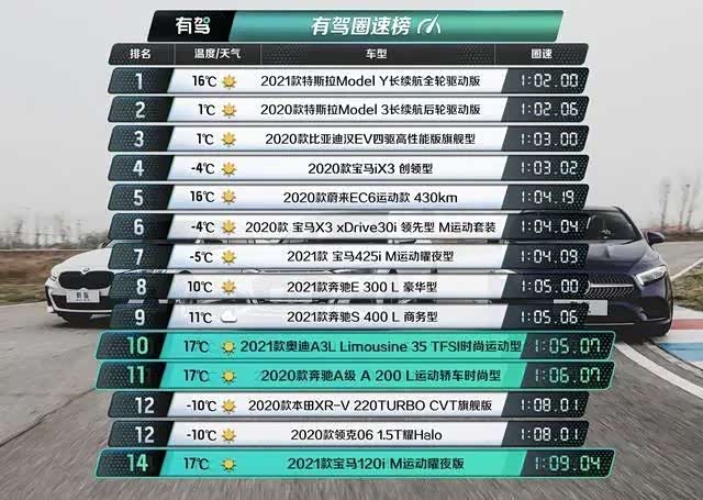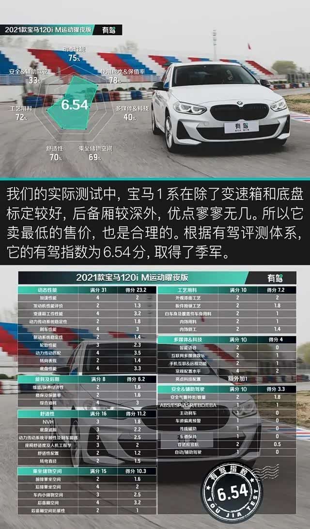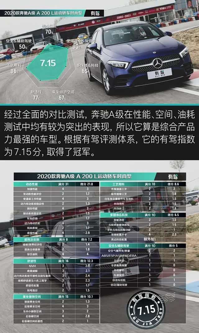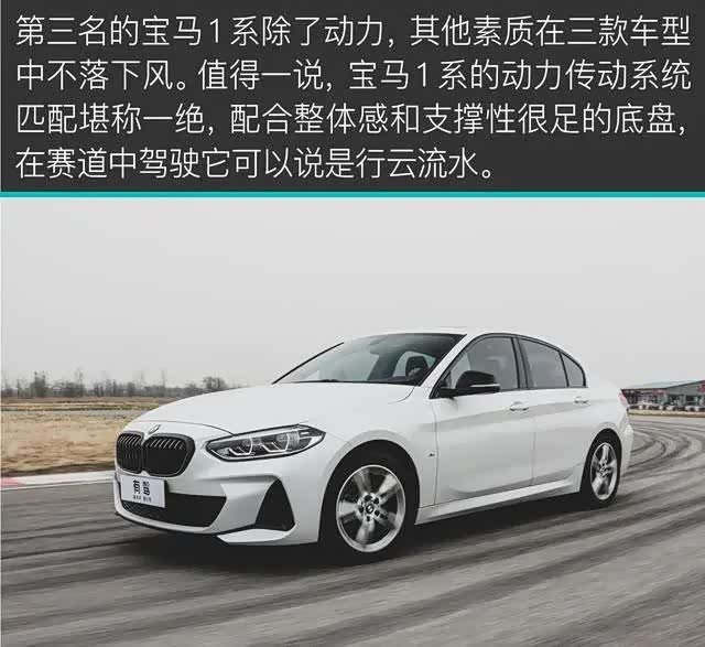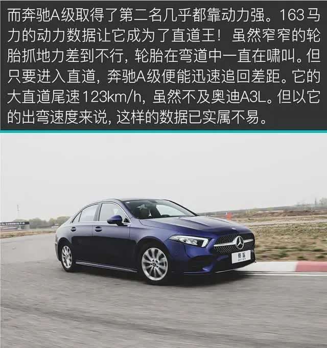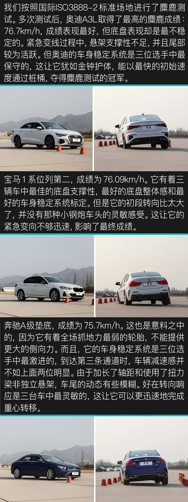 赛道部分做一个小结。奥迪A3L取得第一的原因是轮胎抓地力和其他素质较为均衡;而动力最强的奔驰A级没有取得冠军的原因是差劲的轮胎抓地力;轮胎、变速箱和底盘都不差的宝马1系没有取得好成绩的原因是动力孱弱。