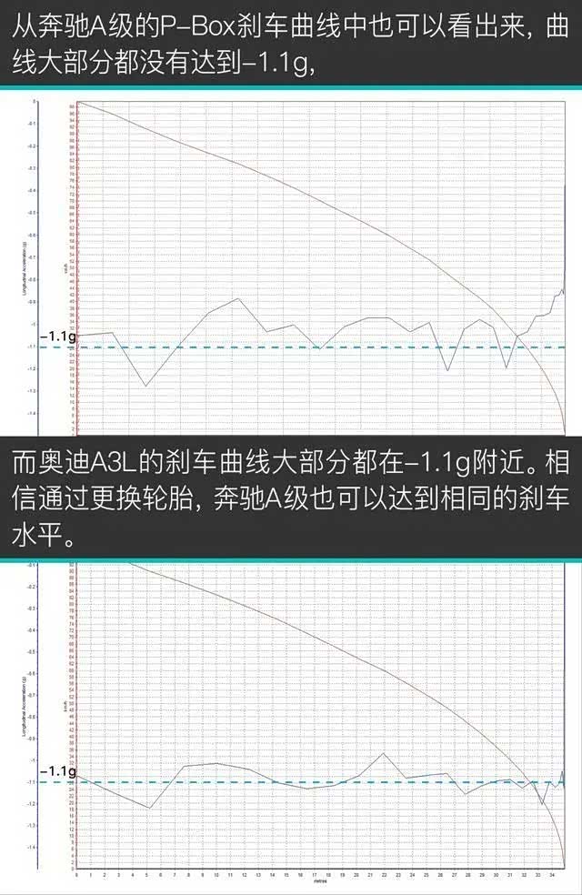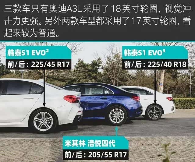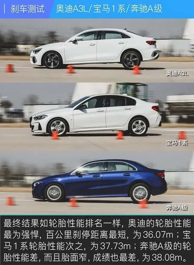 刹车硬件方面,三款车型都配备了前单活塞+通风盘的刹车配置,处于同一水平。所以,刹车距离短不短,基本就看轮胎如何了。奥迪A3L和宝马1系都配备了韩泰运动型轮胎,而奔驰A级配备了米其林节能胎。