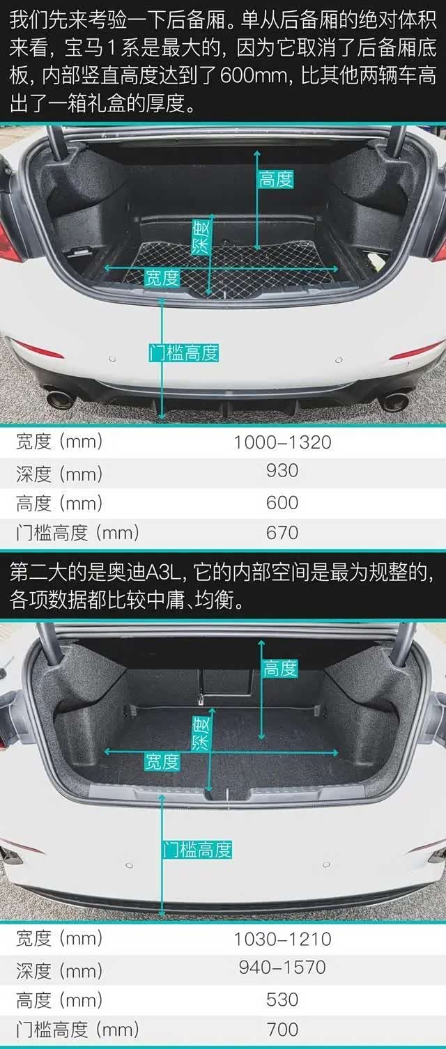 首先,三辆车都是前驱车,奔驰A 200 L和奥迪A3L都经过了轴距加长,后排空间更大,而宝马120i没有加长版本。