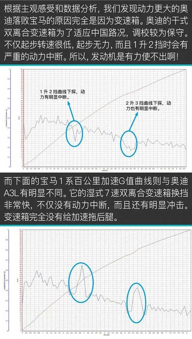 而得益于湿式双离合变速箱,奔驰和宝马的变速箱在起步和换挡都比较干脆利索,起步转速同为2000rpm。奔驰的1.3T发动机因为动力强和轮胎抓地力较低,起步时前轮会出现长时间空转;宝马则是变速箱调校最为激进,每次换挡都伴随着明显冲击。而正是这样的优秀变速箱调校,让它在比奥迪动力弱的情况下,百公里加速却更快。