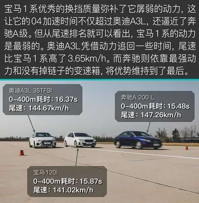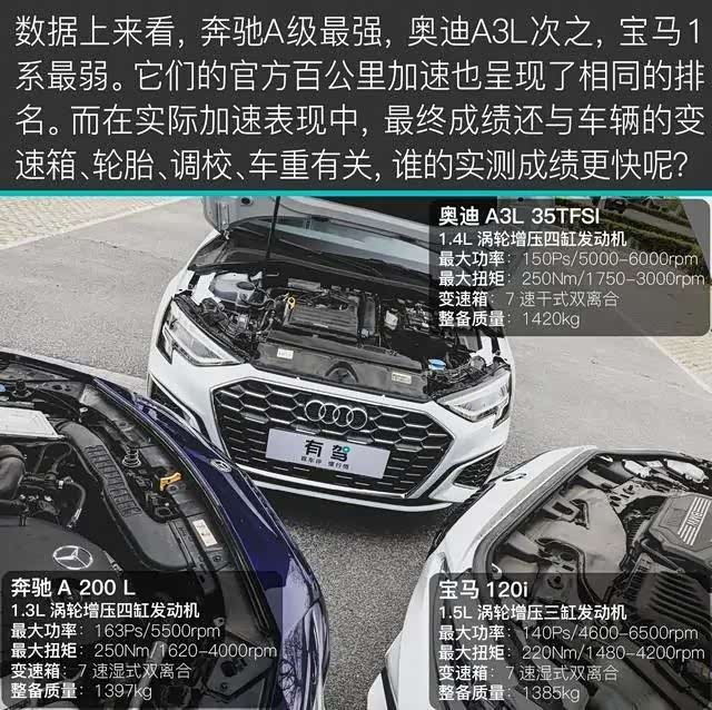 其次,奔驰A 200 L的排量最小,为1.3T四缸发动机,但动力在三款车中最大;宝马1系的1.5T发动机排量最大,但是它是三缸机,动力也最小;而奥迪A3L的1.4T四缸发动机是老机型了,动力处于两者之间。