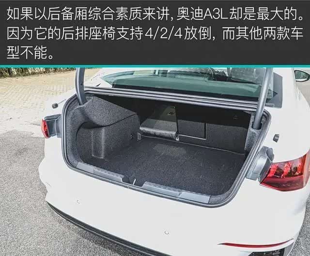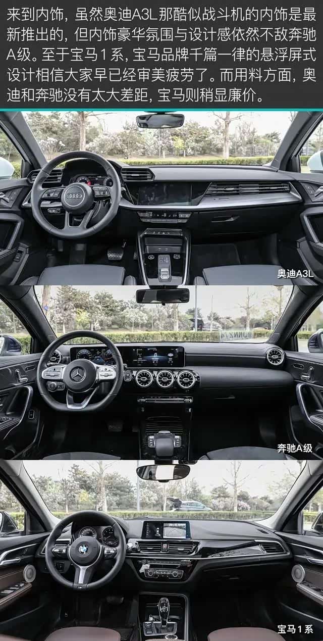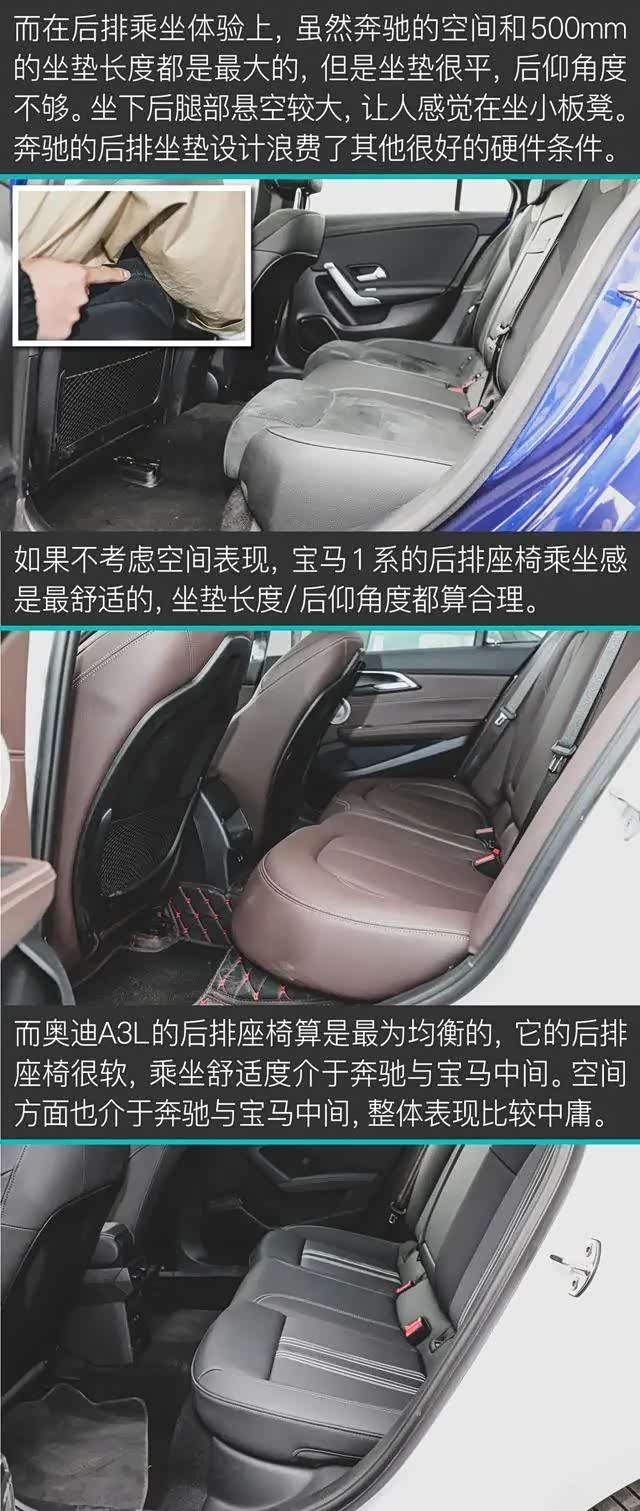 相信您看完这篇文章,对三款车已经有了更直观的认识。奥迪A3L驾乘最舒适,空间/配置/颜值都不差,依然是那个最适合家用的;奔驰A 200 L内饰设计更优秀,动力最强,也最省油,但非独立后悬架有点让人“反胃”;而宝马120i,驾驶感、动力传动匹配,底盘运动素质方面依然是三辆车中最强的。但是,宝马1系这空间、这配置、这舒适度,不敢恭维。